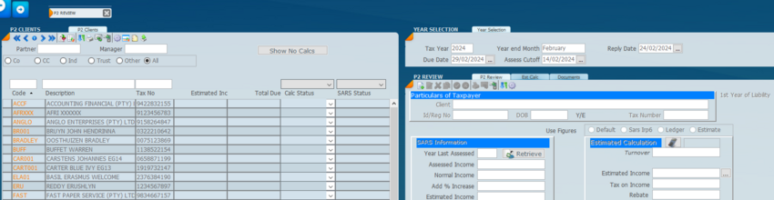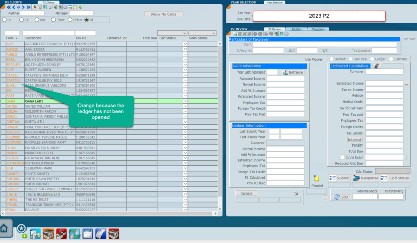 To close this dialogue the system will want confirmation of selection and then will commence the calculation for the clients that are listed in the left hand panel. The screen below will show the ledger figures in place. Notice that the SARS block is blank as we have not retrieved the figures from SARS.