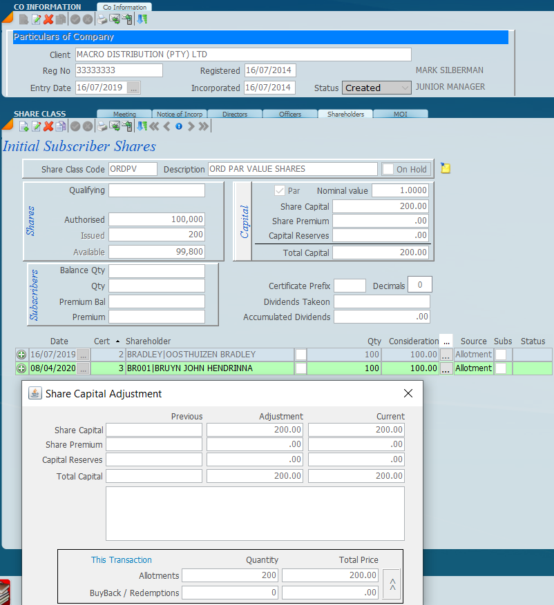 There are various boxes in regard to shares and it would be necessary when starting out to put the share class in by clicking on the new icon and there is space to put in a share class code. Make the share class code unique for all types of shares for a particular company. Eg ORDPV or ORDNPV. You can indicate whether they are par and if so the nominal value of the shares, if they are not par you do not have to indicate anything. It would be a requirement for you to enter the qualifying number of shares, this is the number of shares that a director must hold in terms of the MOI if applicable. The authorised number as per the MOI should be entered here. There is a box where you can enter the subscriber details, the balance quantity, premium balance and the Capital Reserves. On the right hand side there is certificate pre-fix and decimals that you can enter, the dividends taken and accumulated dividends for this particular share class.