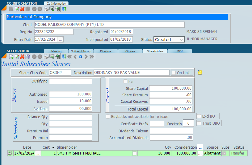 and entering the share capital class and then click on name to enter the shareholders. Ensure that shareholder is in the master file.