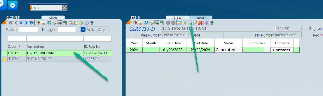 1. Select the client on the panel list and click new and the Gates William will appear on the right panel under IT3-D.