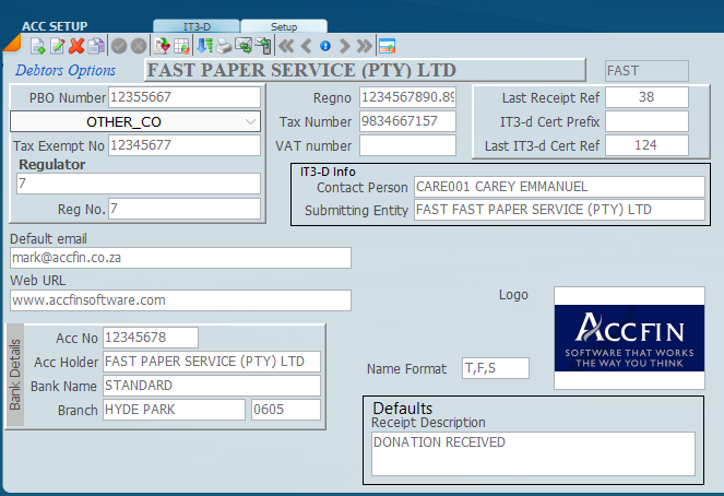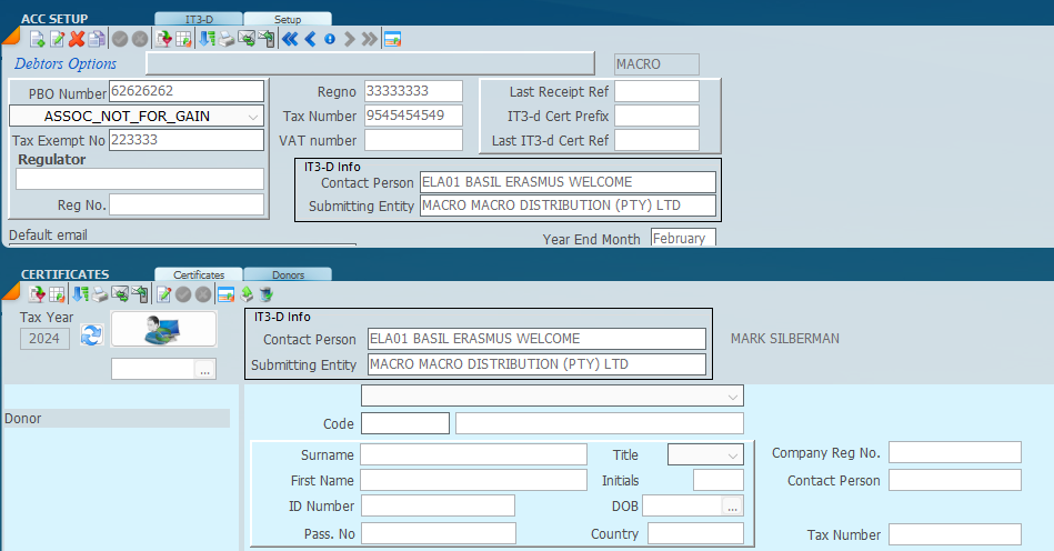 2. Click on the Setup Tab and enter the details of the PBO as indicated on the screen below and complete all the available fields. Ensure that the Filing Period matches the year in question. Enter the IT3-D Info. The Contact Person and the Submitting Entity come from the master file. Ensure that the Submitting Entity is marked in the Portfolio as an IT3-D.