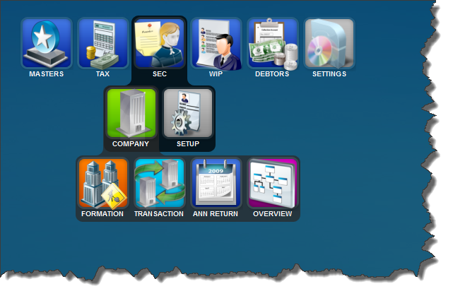 The screen below depicts the various menu options for SKY Sec and the one that you are going to be using most is company and beneath company we have formation, transaction, annual return and an overview screen. The formation is where you form a company and / or take on an entity where you are appointed as the Secretarial Practitioner. The transaction is where you carry out your daily secretarial transactions. The annual return is where you manage the whole annual return process and the overview is where you will get a good idea of the Company Secretarial status of any particular entity with powerful screen enquiries.