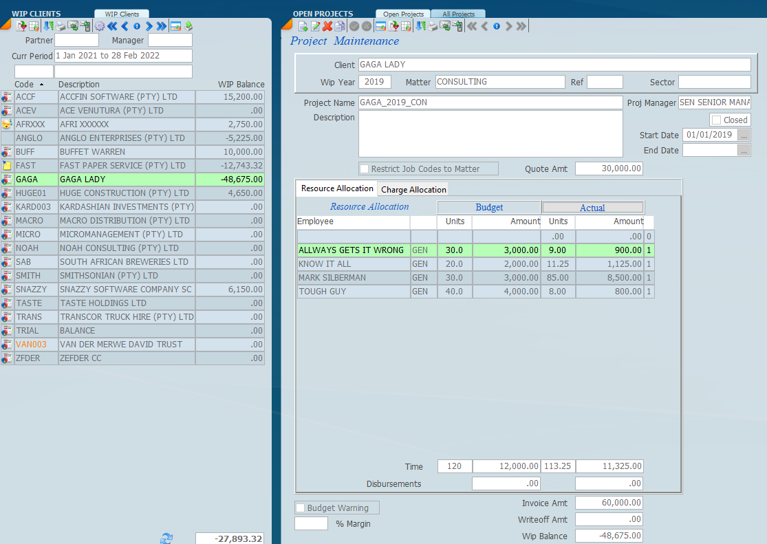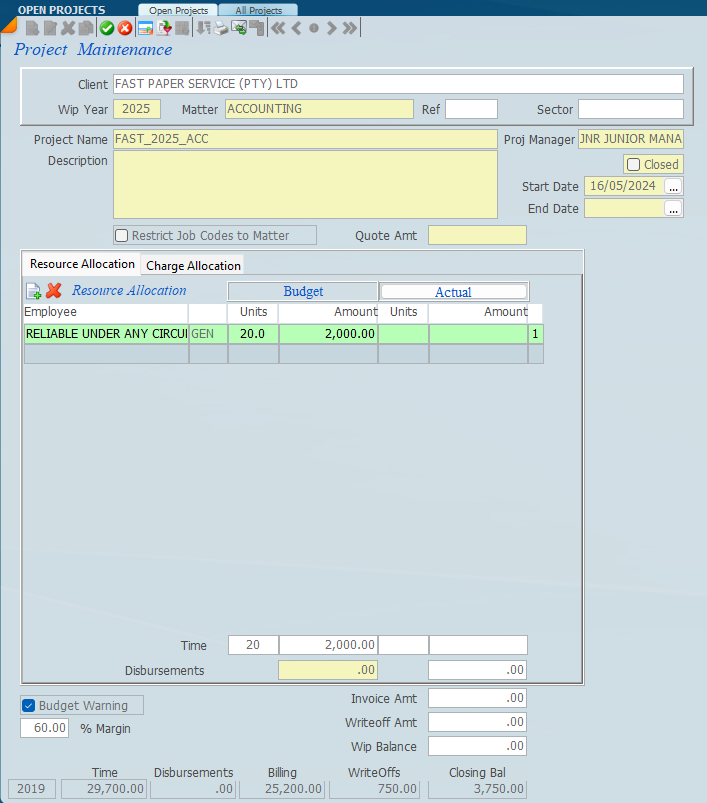 In order to create a project click on a client on the left hand side and click on a the new icon. Then select a wip year, a matter and a sector if required. The project name will automatically be inserted into the project name area. Underneath that we can detail a description of what the project is. In the screen below you will see that there is a resource allocation. If Restrict Job Codes to Matter is ticked the system will only allow job codes that are linked to the matter to be allocated to the project.