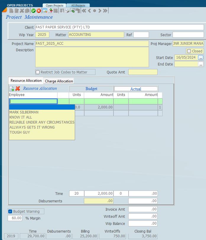 There is however a situation which may arise during the progression of a particular job in that an employee charges time who was not originally allocated to the project. In this instance one needs to allocate a blank line record as a resource as is indicated on the screen below.This means that any employee can allocate time to the job.