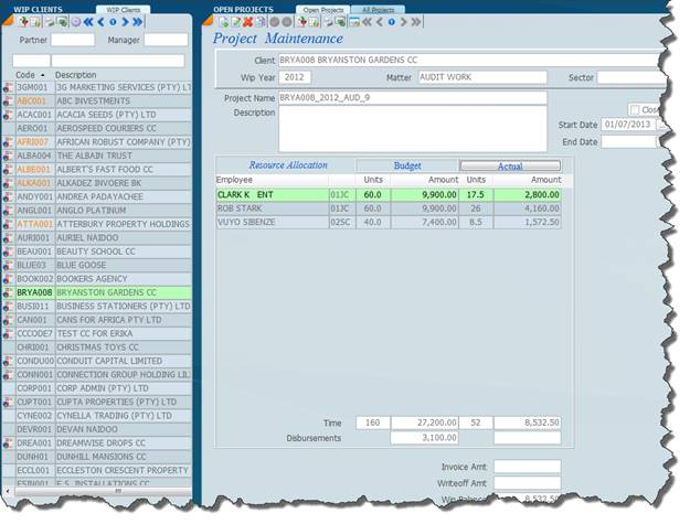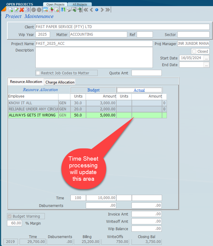 This now completes the setting up of the project and as the time is allocated into the project the system will automatically give you the difference between budget and actual.
