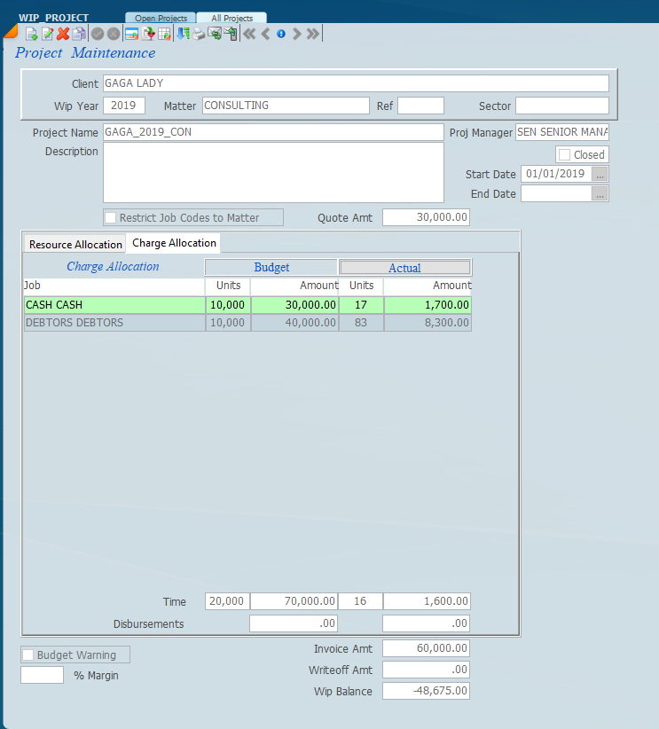 One can allocate a charge allocation for different types of jobs like cash and debtors as shown below as part of the budget.