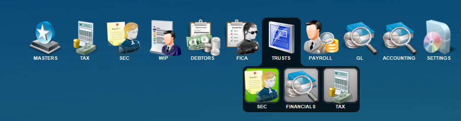 Select the Trusts icon and choose the Secretarial Option to work on the Trust Secretarial aspects or the Financial aspects or the Tax aspects.