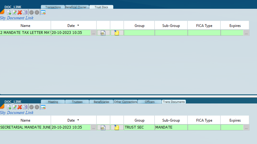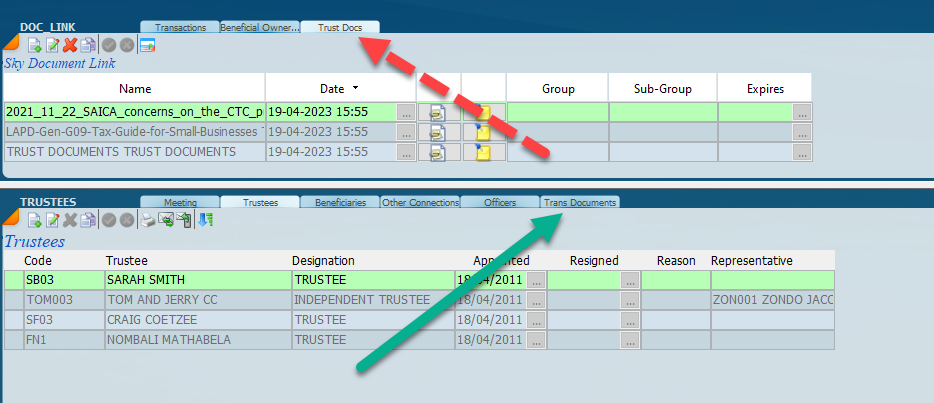 The Trust Docs tab on the top should be used to keep all the main trust documents and the tab on the bottom should be used specifically for documents that relate to the specific transactions.