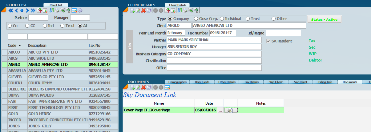 On the screen below the Documents Tab will allow the storage of an unlimited number of documents. Documents from within each module can be stored but can all be seen from the master file. The group and subgroups can be used to sort the documents for easier access. Eg. Tax, Sec, Drs, Trusts.