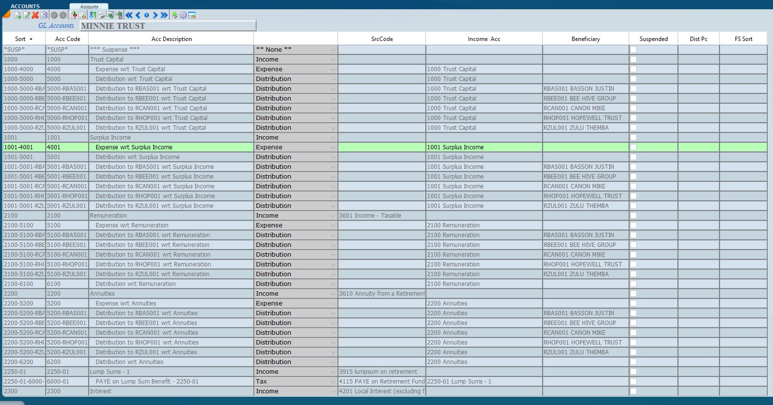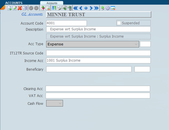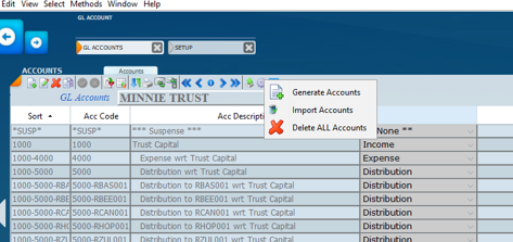 This screen allows the view of all available GL accounts for the trust setup which can be added and modified as required. If tax return filing is to be done ensure that the correct source codes are entered on the screen for those accounts that are required.