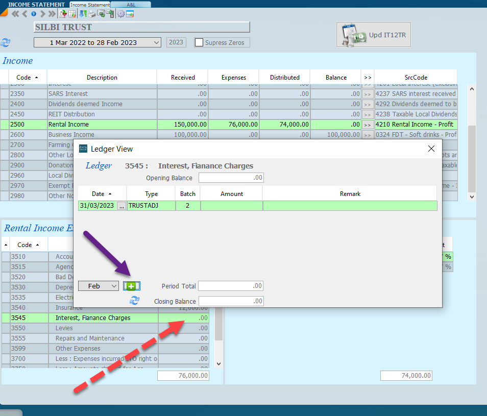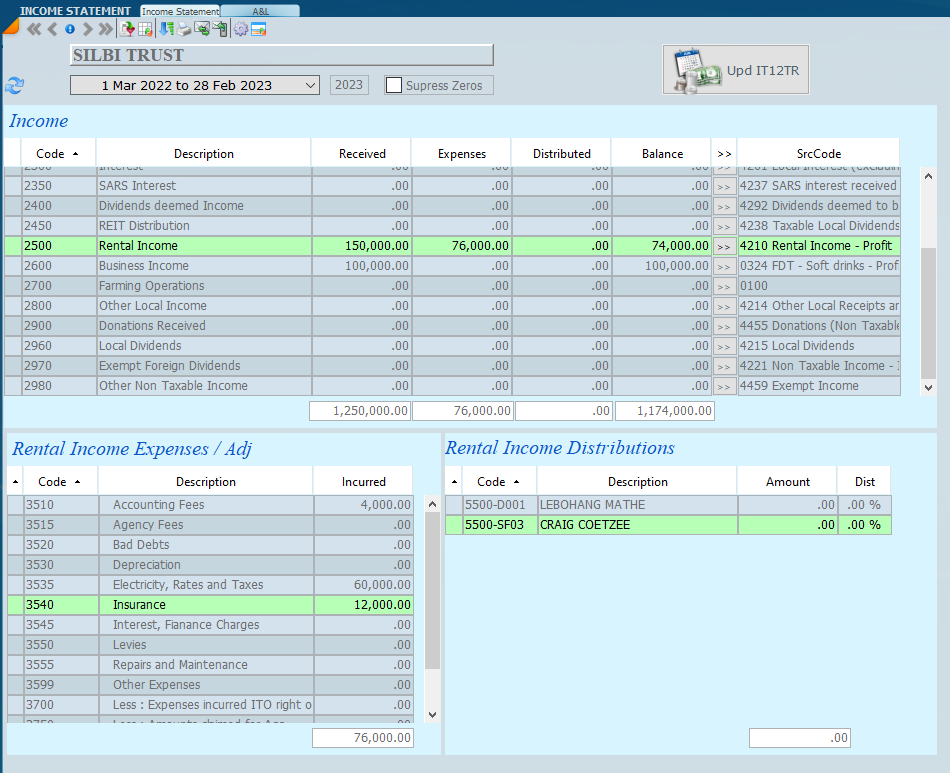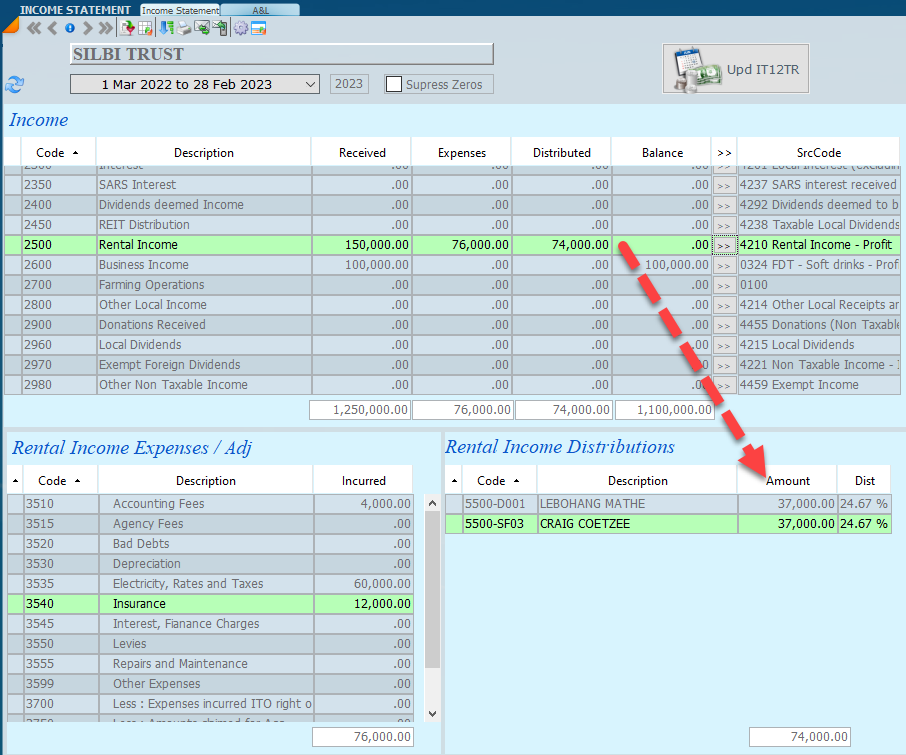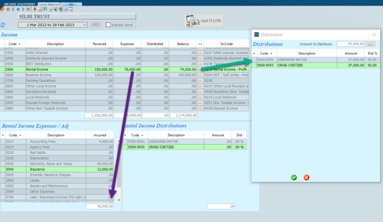 A distribution can be performed from the income statement screen below. Note the rental income received and the expenses which can be viewed in the box below.