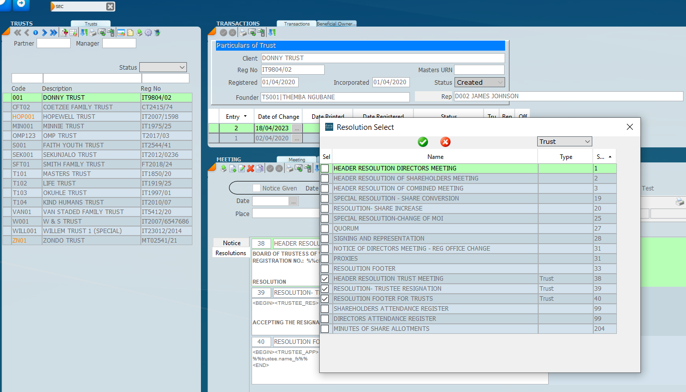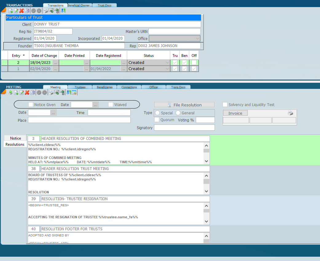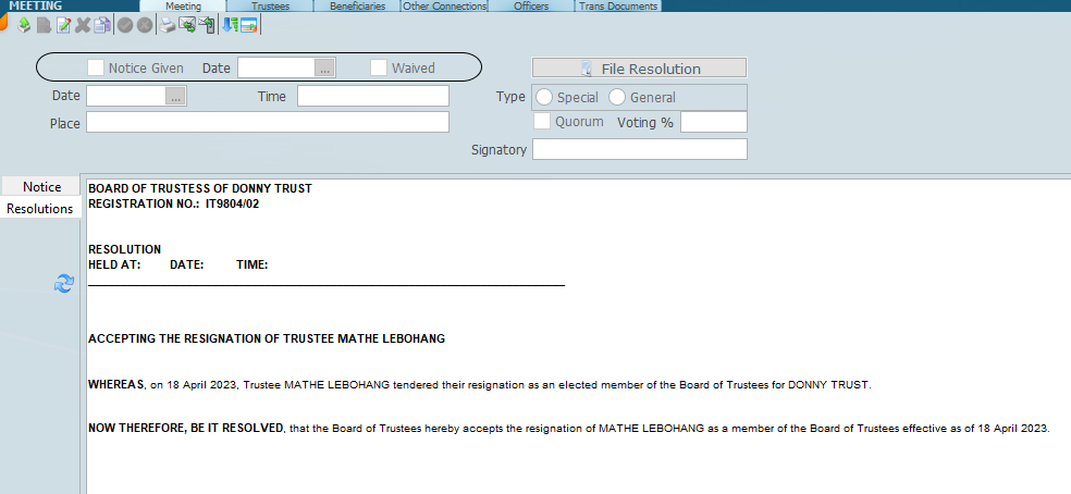 Under the legislation there are many different kinds of trust resolutions. Not all of these resolutions have to be submitted to the Master. It is still necessary to produce the resolutions for confirmation. The meeting tab is where you can set up these resolutions and you will see that there is place for typing free form text that will fit into the special resolution or by selecting a paragraph code which will automatically be put into the resolution.