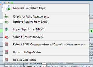 Click here for various additional menu options which will process all the tax returns listed on the left.
